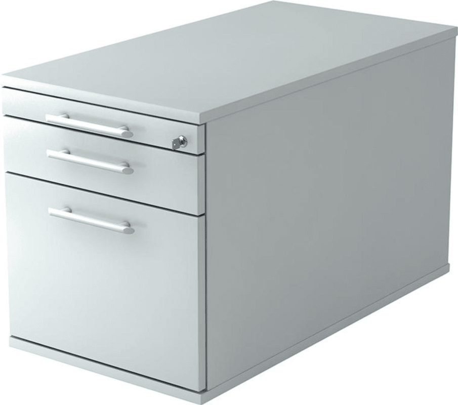 Rollcontainer zur Schreibtischserie Solid, Schubfach und Hängeregisterauszug • Material: melaminharzbeschichtet Platte nach DIN 68765 • Teleskop-Metall-Kugelführungen: mit Selbsteinzug und Soft-Stopp