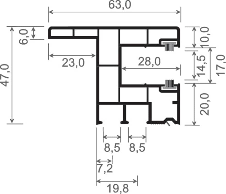 Rollladenführung 63x47 mm Lg. 6,00 m foliert, mit Nase, mit zwei schwarzen Bürsten GK Grau 446 6062 JET BLACK MATT [145]