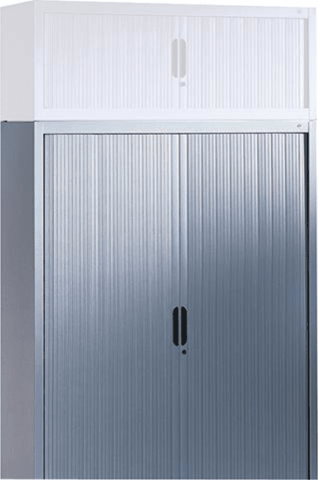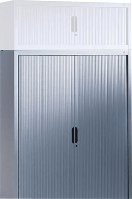 Rollladenschrank • Korpus: Stahlkonstruktion mit hochwertiger Einbrennbeschichtung • Rollladen: aus durchgehenden Kunststoffmatten (recycelbar), leichtgängig und geräuscharm, verschwinden vollständig