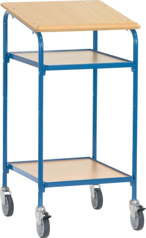 Rollpult, mit Ablage • Stahlrohr-/Profilstahl-Konstruktion: geschweißt • Schreibfläche: Holzwerkstoff mit Anschlagleiste • Ablageböden: 2 Stück, der obere mittig einschraubbar – für 2 Ordnerreihen üb