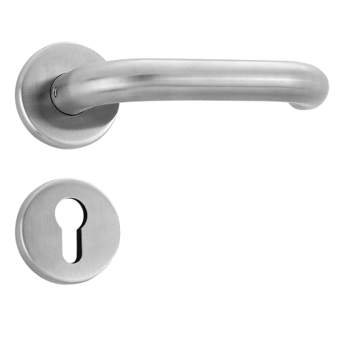 BKS Drückergarnitur ANDANTE B 7290; Abdeckung: mit Rosetten; Form: rund; Vierkant: 8 mm; Material: Edelstahl; Befestigungsart: verdeckt verschraubt; Befestigungstechnik: mit Stütznocken; Basis: Drückergarnitur; Lochung: Profilzylinder gelocht; Farbton: edelstahl; Oberfläche: matt; Anschlagrichtung: Drücker rechts/links verwendbar; Türstärke min.: 38 mm; Türstärke max.: 45 mm; Stärke Abdeckung: 8 mm; Durchmesser: 55 mm; Lagerung: festdrehbar mit Hochhaltemechanik; Norm: DIN EN 1906; Drückerform: U-Form; Drückerdurchmesser: 21 mm; Drückerhöhe: 60 mm; Drückerlänge: 141 mm; Drückerbefestigung: Vierkantstift; Befestigungssystem: Stiftverbindung; Türart: Abschlusstüren; Türwerkstoff: Holz,Stahl; Einsatzbereich: Zimmertür; DIN-Richtung: DIN Links-Rechts