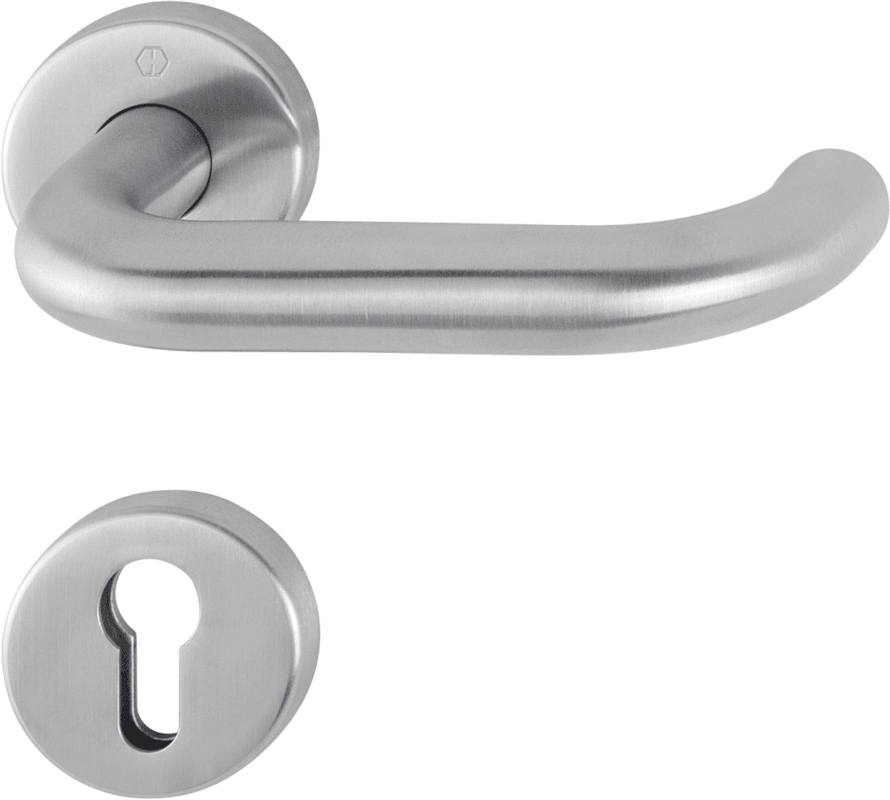 HOPPE für Fluchttüren Drückergarnitur Paris FS-E138F/42/42S, Rosette, rund, Profilzylinder gelocht, Vierkant 9mm, DIN Links-Rechts, Türstärke 40 - 65mm, mit Stütznocken, edelstahl matt festdrehbar