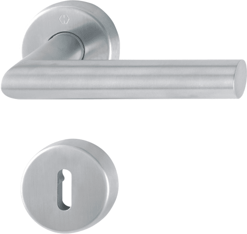 Edelstahl-Rosetten-Türgriff-Garnitur mit Schlüsselrosetten für Innentüren Amsterdam. • Lagerung: Türgriffe fest/drehbar, Rückholfedern, HOPPE-Steckgriff-Verbindung mit Kugel-Arretierung Sertos®, wartu