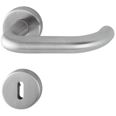 HOPPE-Edelstahl-Rosetten-Türgriff-Garnitur mit Schlüsselrosetten für Innentüren: • geprüft nach DIN EN 1906: 37-0140A, Objekt-Garnitur • Lagerung: Türgriffe lose, Rückholfedern rechts/links verwendbar