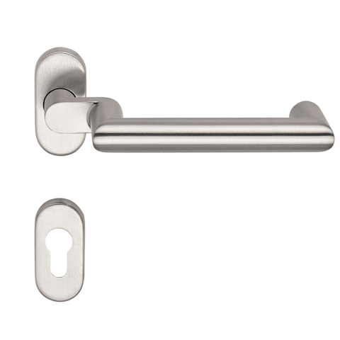 BKS Drücker-Halbgarnitur BELCANTO-PANIK B-72130; Material: Edelstahl; Befestigungsart: verdeckt verschraubt; Befestigungstechnik: ohne Stütznocken; Abdeckung: mit Rosetten; Form: oval; Benutzerklasse: Klasse 4; Stärke Abdeckung: 9 mm; Einsatzbereich: Feuerhemmend; Basis: Drücker-Halbgarnitur; Lochung: Profilzylinder gelocht; Vierkant: 9 mm; Befestigungssystem: Stiftverbindung; Türstärke min.: 65 mm; Zulassung: für Feuerschutz,für Notausgänge,für Rauchschutz; Türstärke max.: 80 mm; DIN-Richtung: DIN Links-Rechts; Lagerung: festdrehbar,wartungsfrei; Breite: 32,7 mm; Länge: 70 mm; Oberfläche: matt gebürstet; Farbton: edelstahl; Norm: DIN 18273,DIN EN 179,DIN EN 1906; Türart: Rahmentüren,Fluchttüren; Drückerbefestigung: Vierkantstift; Anschlagrichtung: Drücker rechts/links verwendbar; Türwerkstoff: Aluminium,Stahl; Drückerhöhe: 80 mm; Drückerlänge: 173 mm; Ausführung: mit Drücker H3.2; Drückerform: U-Form,Gehrung,versetzt; Drückerdurchmesser: 21 mm
