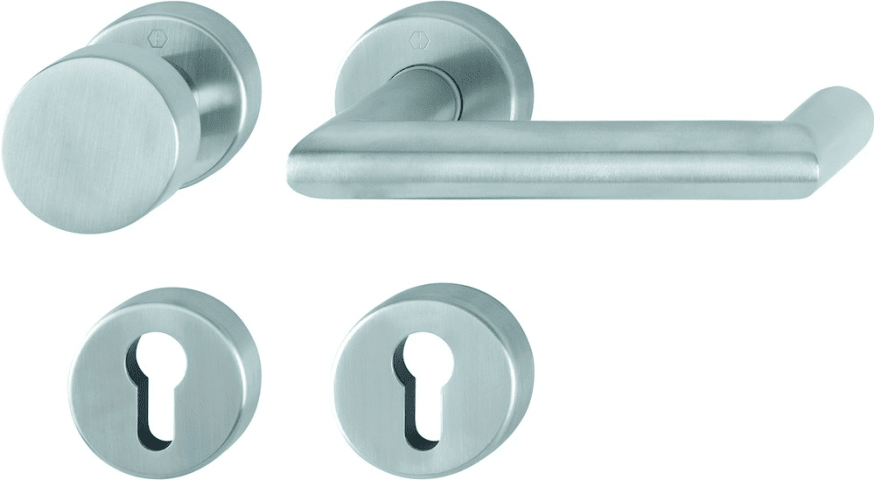 Edelstahl-Rosetten-Wechsel-Garnitur mit Schlüsselrosetten für Wohnungsabschluss-Türen Rotterdam. • Lagerung: außen Knopf fest, innen Türgriff fest/drehbar, Rückholfeder, HOPPE-Steckgriff-Verbindung mi