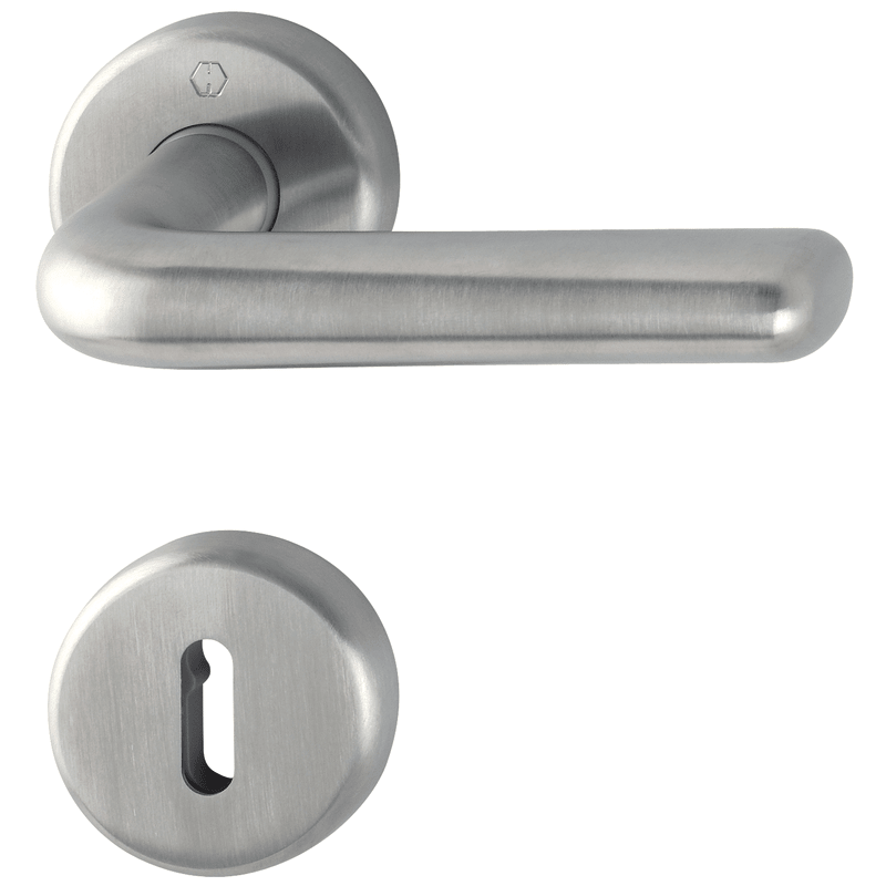 Edelstahl-Innentür-Rosetten-Garnitur (Türgriff-Garnitur): Türgriffe mit HOPPE-Profilstift-Verbindung, Rosetten mit Kunststoff-Unterkonstruktion, Rückholfeder und Stütznocken, verdeckte, durchgehende Verschraubung mit selbstschneidenden Gewindeschrauben.