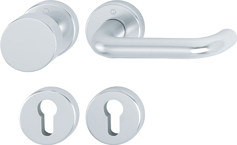 Aluminium-Innentür-Rosetten-Garnitur in Einzelverpackung. Türgriffe mit HOPPE-Schnellstift-Verbindung (mit Hoppe Vollstift), Rosetten mit Kunststoff-Unterkonstruktion, Rückholfeder und Stütznocken, ve