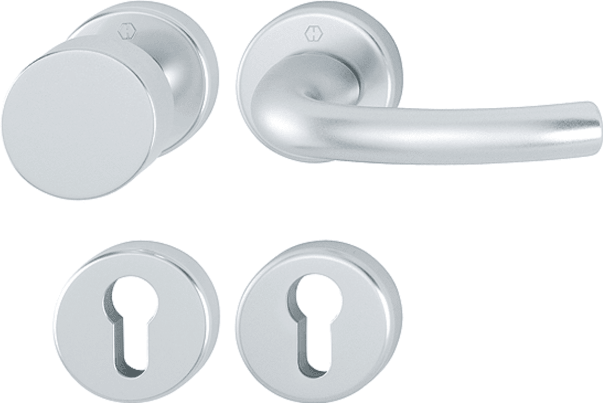 Aluminium-Innentür-Rosetten-Garnitur (Türgriff-Garnitur): geprüft nach DIN EN 1906 (Benutzungs-Kategorie 3), Türgriffe mit HOPPE-Schnellstift-Verbindung (mit HOPPE-Vollstift), Rosetten mit Kunststoff-