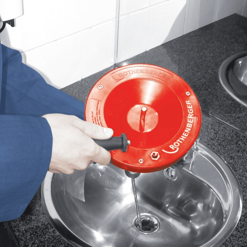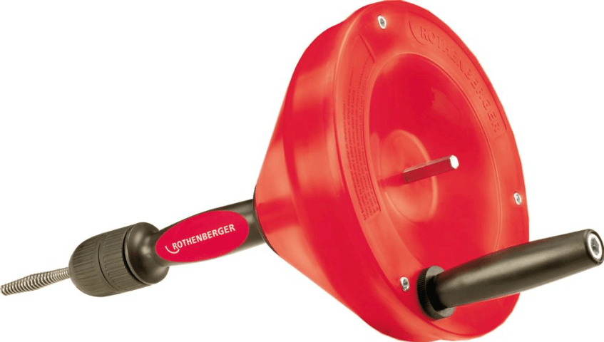 Rohrreinigungsgerät ROSPI®• Kurbel-Handbetrieb und 6-kant-Antrieb zum Einspannen in Bohrfutter für Hand-Bohrmaschinen • Schlagfester, geschlossener und schmutzgeschützter Kunststoff-Spiralenbehälter