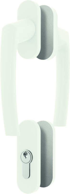 ROTO Griffgarnitur RotoLine; Ausführung: abschließbar,mit Rosetten; Material: Aluminium; Vierkant: 7 mm; Rastung: 90°; Befestigungsart: verdeckt verschraubt; Befestigungstechnik: mit Stütznocken; Lieferung: mit Schrauben,mit Vierkantstift; Einsatzbereich: Fenstertür; Basis: Griffgarnitur; DIN-Richtung: DIN Links-Rechts; Nockendurchmesser: 9,7 mm; Sockelbreite: 28,6 mm; Sockelhöhe: 65,6 mm; Sockelstärke: 10 mm; Befestigungsabstand: 43 mm; Oberfläche: pulverbeschichtet; Farbton: verkehrsweiß; Fensterart: Kunststofffenster,Holzfenster,Aluminiumfenster; Lochung: Profilzylinder gelocht; Außengriff/Innengriff: Außengriff fest verstiftet,innen Standard; Funktion: Standard; Stärke Abdeckung außen: 10 mm; Stärke Abdeckung innen: 8,5 mm; Stift vorstehend: 127 mm; Fensterwerkstoff: Aluminium,Kunststoff,Holz; Aufdruck: ohne Logo