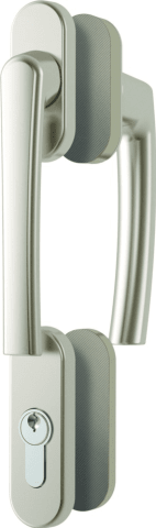 Schiebefenstertüren,Griff,Standard,Türgriffgarnitur,mit PZ-Rosette,Profilzylinder gelocht,VK8mm,Aluminium,Patio Z,mit Vierkantstift,Innen- und Außenbedienung,mit Logo,verdeckt verschraubt,Fensterwerkstoff Kunststoff,Holz,Aluminium,mit Stütznocken,eloxiert silber,Nockendurchmesser 10mm,DIN Links-Rechts