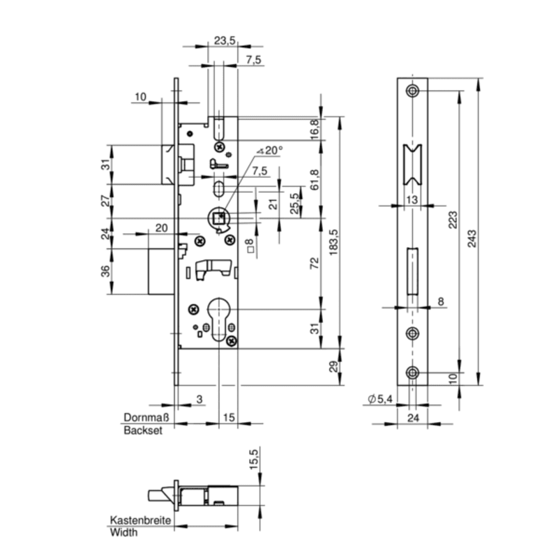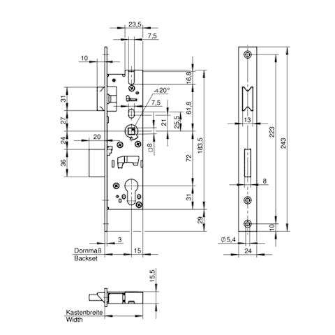 Kastenbreite Dornmaß + 15 mm