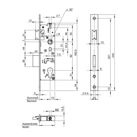 Kastenbreite Dornmaß + 15 mm