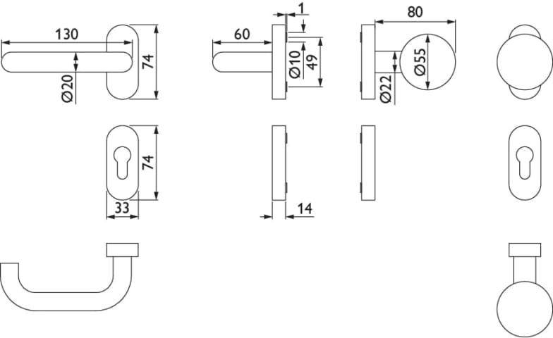 RR-FH-Wechselgarnitur 1801 / 20 mm Ø BASIC 01, mit Rosette 2085 fest/drehbar, Ausf.: PZW, Knopf 3126, Cliprosette 2085 PZ, inkl. Vk für TS 65-88, ohne Befestigungsschrauben, Oberfl. 60 (Edelstahl matt)