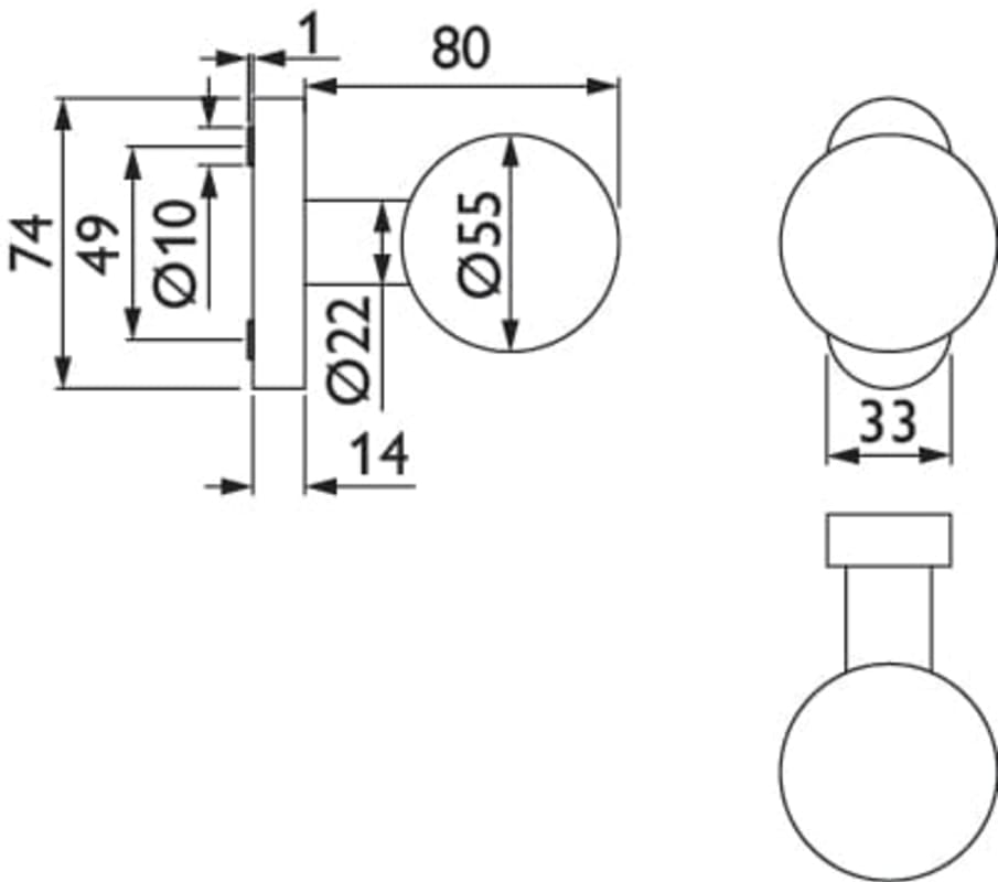 RR-Kugelknopf 3126 gerade, fest auf Rosette 2085, mit M12 Innengewinde für Wechselstift, ohne Stift und Schrauben, Oberfl. 60 (Edelstahl matt)
