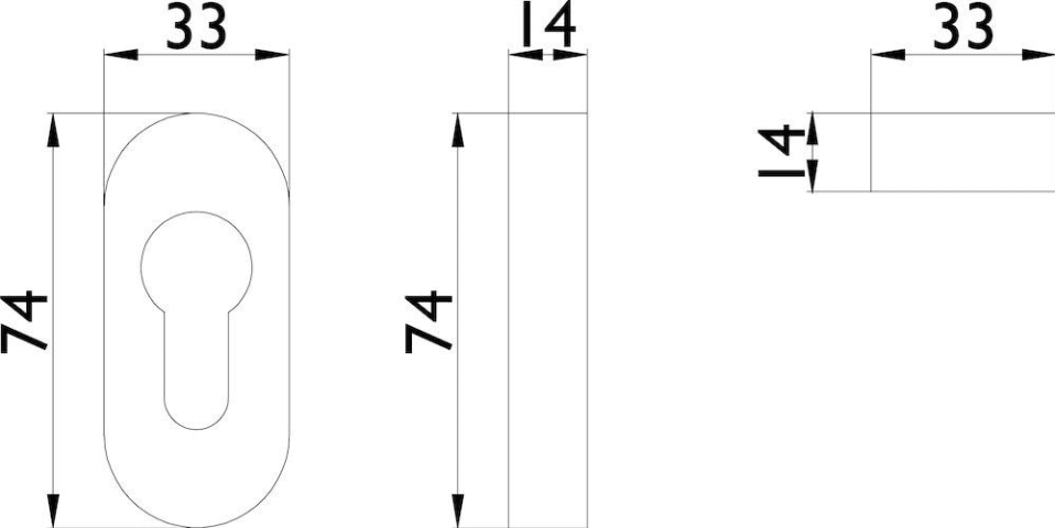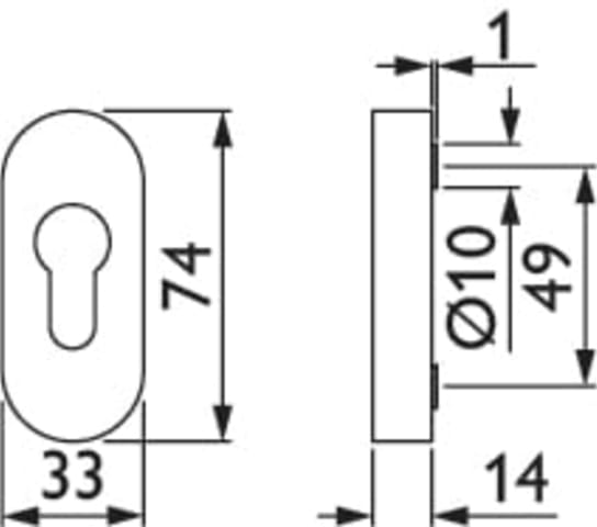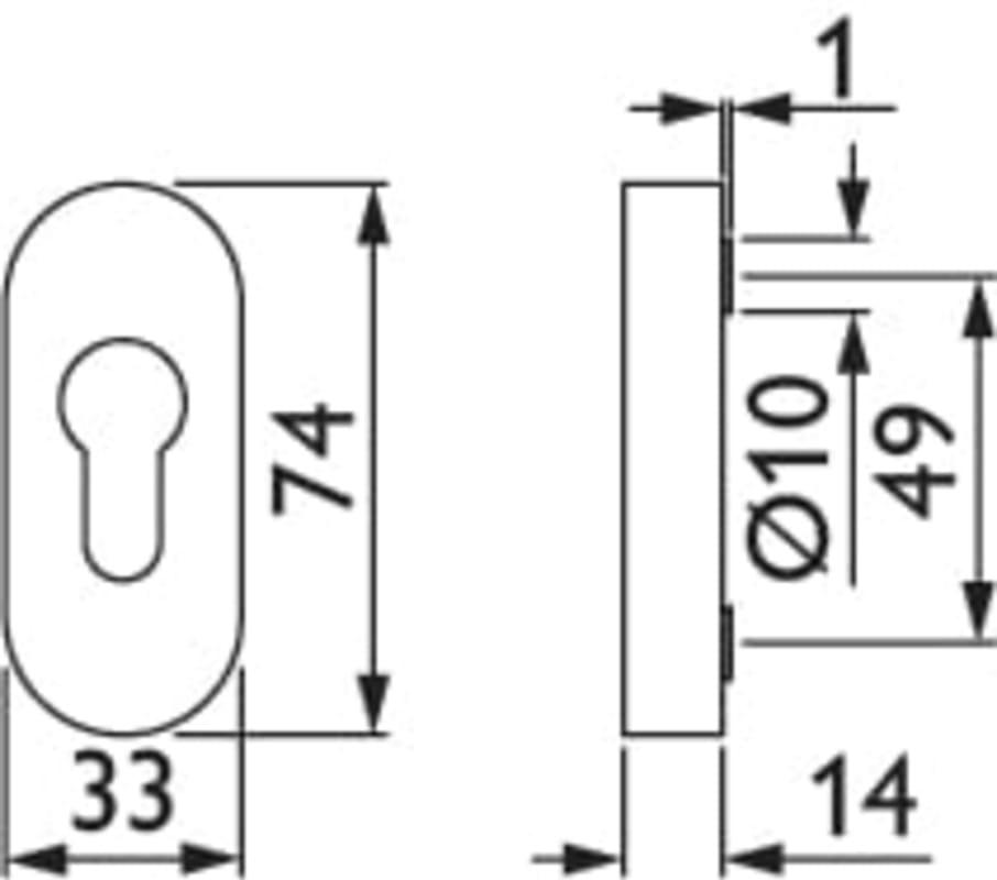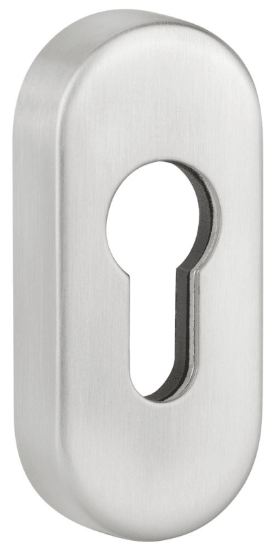 HERMAT Schlüsselrosette 2085; Produkttyp: Schlüsselrosette; Produkttyp (Hersteller): Schlüsselrosette; Anwendung: außen/innen; Form: oval; Befestigungsart: verdeckt verschraubt; Material: Edelstahl; Länge: 74 mm; Breite: 33 mm; Material Unterkonstruktion: Kunststoff-Stahlverbundbau; Einsatzbereich: Tür; Norm: DIN 18273; Türart: Rohrrahmen; Zulassung: für Feuerschutz,für Rauchschutz; Lochung: Profilzylinder gelocht; Farbe: grau; Farbton: edelstahl; Oberfläche: matt; Stütznocken: ohne Stütznocken; Höhe: 14 mm