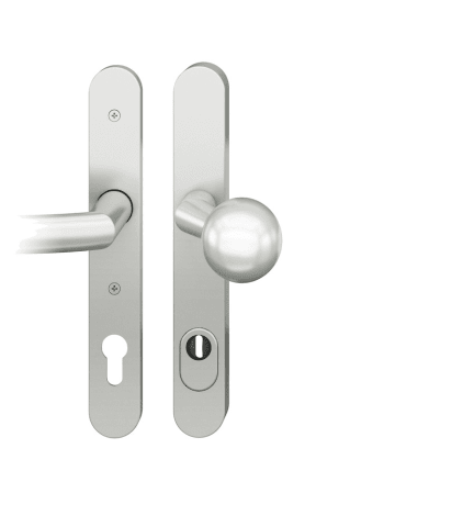 Wechselgarnitur für Rahmentüren, Türdrücker mit festdrehbarer Lagerung, Außenschild 14 mm, Innenschild 7 mm.