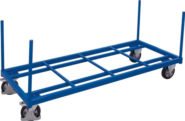 Schwerlast Rungenwagen, offen • Profilstahl-/Stahlrohr-Konstruktion: geschweißt, pulverbeschichtet in RAL 5010 enzianblau • 4 Eckhülsen • Lichte Breite: 805 mm • Rollen: 2 Bock- und 2 Lenkrollen mit Feststeller, gemäß Norm Lenkrollen mit Radfeststeller und Fußschutz • Reifen: Vollgummi-Elastik-Bereifung • Naben: Präzisions-Rillenkugellager Hinweis: Für den Transport von Langmaterialen.