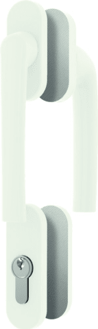 ROTO Griffgarnitur Roto Samba; Ausführung: mit Rosetten,abschließbar; Material: Aluminium; Vierkant: 7 mm; Rastung: 90°; Befestigungsart: verdeckt verschraubt; Befestigungstechnik: mit Stütznocken; Lieferung: mit Vierkantstift; Einsatzbereich: Fenstertür; Basis: Griffgarnitur; DIN-Richtung: DIN Links-Rechts; Nockendurchmesser: 9,7 mm; Sockelbreite: 28,6 mm; Sockelhöhe: 68 mm; Sockelstärke: 8 mm; Befestigungsabstand: 43 mm; Oberfläche: pulverbeschichtet; Farbton: verkehrsweiß; Fensterart: Kunststofffenster,Holzfenster,Aluminiumfenster; Lochung: Profilzylinder gelocht; Außengriff/Innengriff: Außengriff fest verstiftet,außen flach,innen Standard; Funktion: Standard; Stärke Abdeckung außen: 8 mm; Stärke Abdeckung innen: 8 mm; Stift vorstehend: 127 mm; Fensterwerkstoff: Kunststoff,Holz,Aluminium; Aufdruck: mit Logo