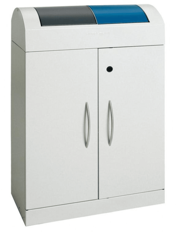 Wertstoffsammler Sortsystem TD • Material: Stahlblech, verzinkt • Oberfläche: pulverbeschichtet • Pendelklappe: selbstschließend, geräuscharm, farbig pulverbeschichtet oder aus Edelstahl • Türgriffe: