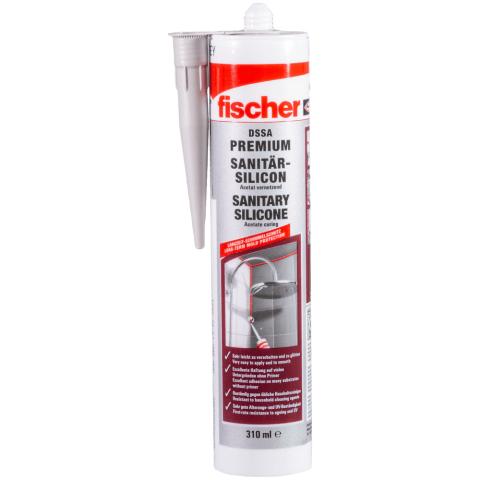Das hochwertige fischer Sanitärsilicon DSSA SW zur Verwendung bei Eck-, Bewegungs- und Anschlussfugen im Sanitär- und Küchenbereich. Farbe: schwarz. Ermöglicht ein leichtes Verarbeiten und Glätten und sorgt für einen zügigen Arbeitsfortschritt. Durch die Dehnfähigkeit von 25 % ist DSSA sehr gut geeignet für stark beanspruchte Dehnfugen, sehr gute Haftung und hohe Abriebfestigkeit.
