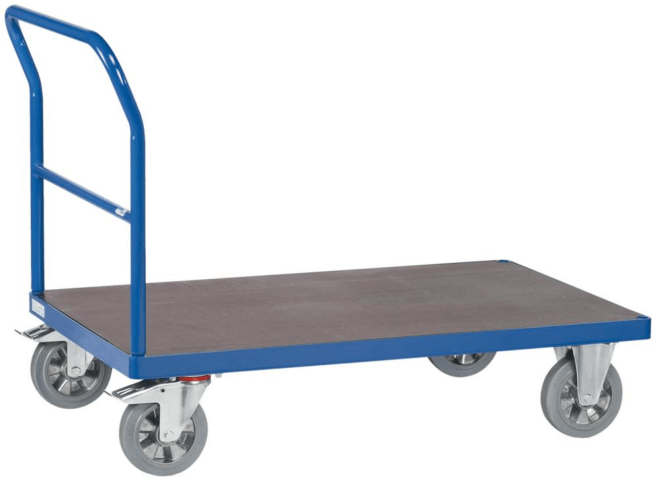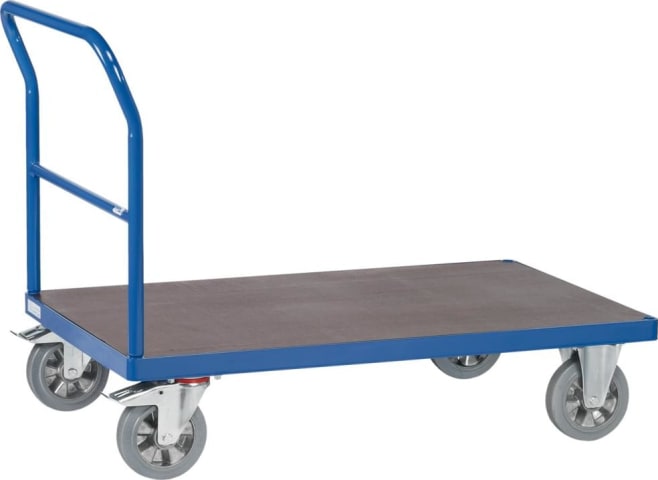 Schwerlast-Schiebebügelwagen • Stahlrohr-/Profilstahl-Konstruktion: geschweißt, pulverbeschichtet in RAL 5007 brillantblau • Plattformen: rutschsichere Siebdruckplatten aus wasserfestem Sperrholz • Rollen: 2 Bockrollen, und 2 Lenkrollen mit Feststeller, gemäß der Europäischen Norm EN 1757-3 (Sicherheit von Plattformwagen) • Bereifung: Elastik-Vollgummi-Bereifung, Ø 200 x 50 mm • Naben: Kugellager Hinweis: Baukastensystem.