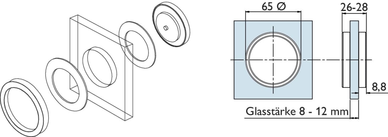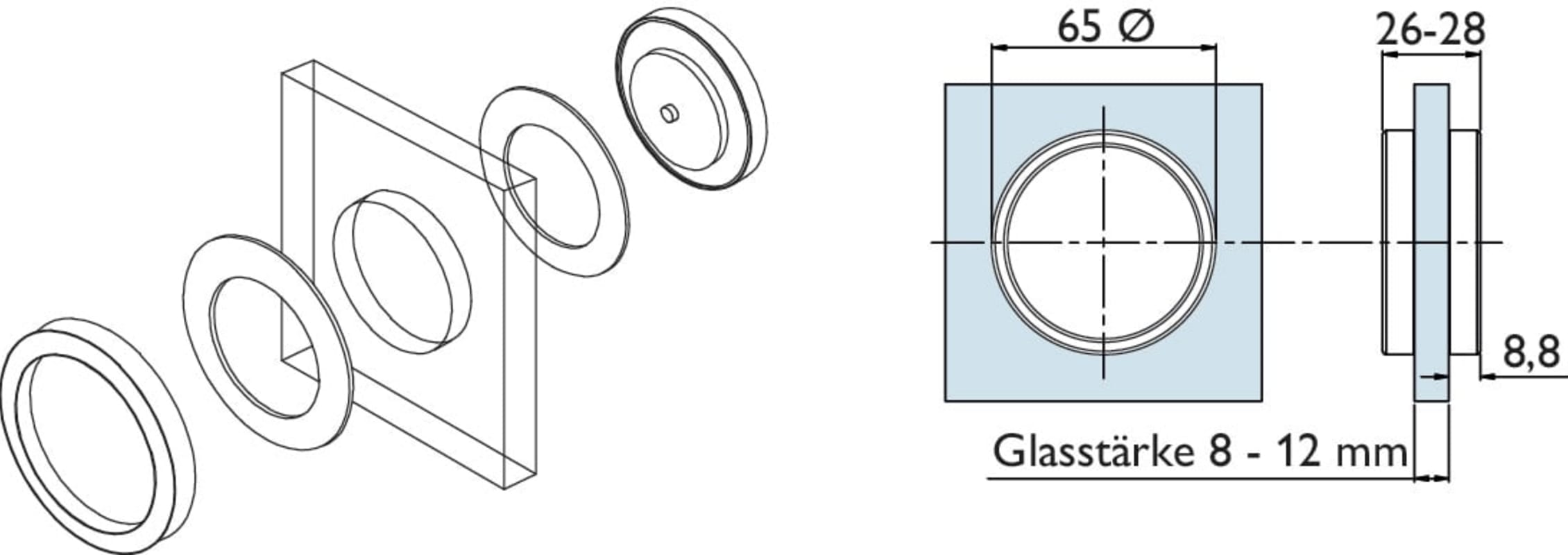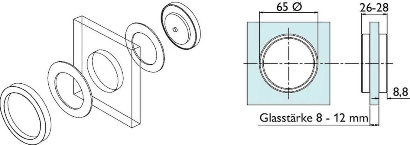 Schiebetür-Griffmuschel 6403 geschlossen, für 8 - 12 mm Glasstärke, Glasbohrung 50 mm, Außendurchmesser 65 mm, Oberfl. 61 (Edelstahl poliert)