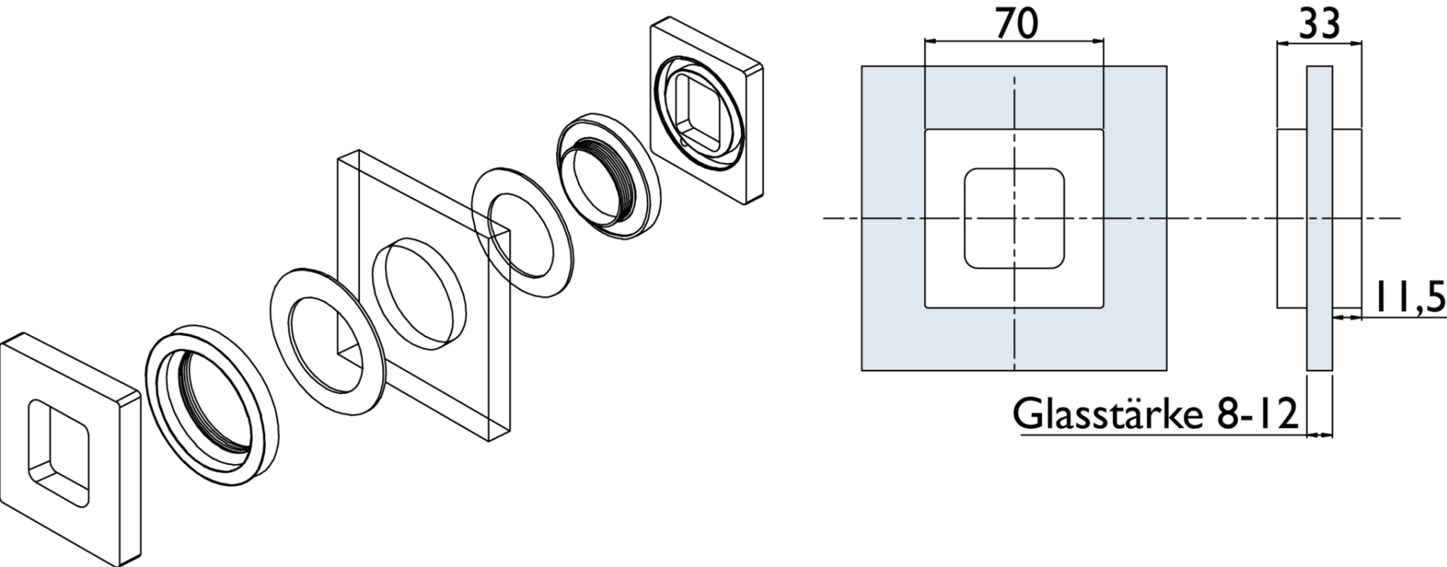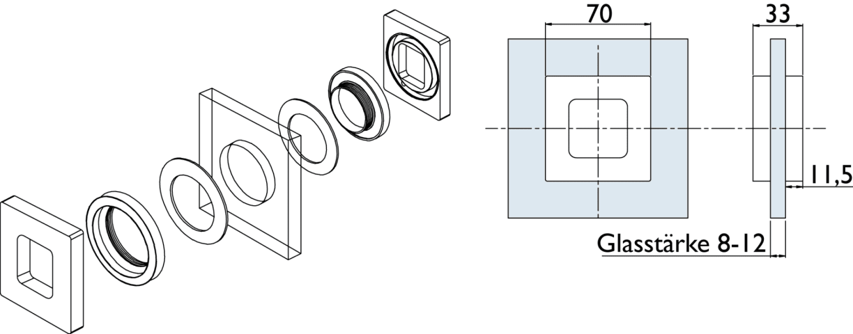 Schiebetür-Griffmuschel 6401 K offen, für 8 - 12 mm Glasstärke, Glasbohrung 50 mm, kantige Ausführung, Oberfl. 20 (Edelstahlfarben)
