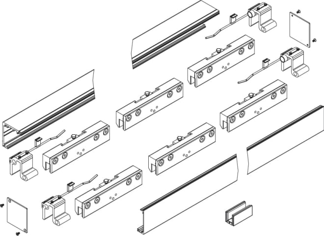 Schiebetür-Klemmbeschlag 2 flg. 9171 für Glas, für Wand- oder Deckenm., Laufschiene 3001-4000 mm, inkl. Abdeckprofil, Tragkr. 120 kg, ohne Dämpfer, 6 Laufwagen, 2 Endkappen, ohne Selbsteinzug, Oberfl.