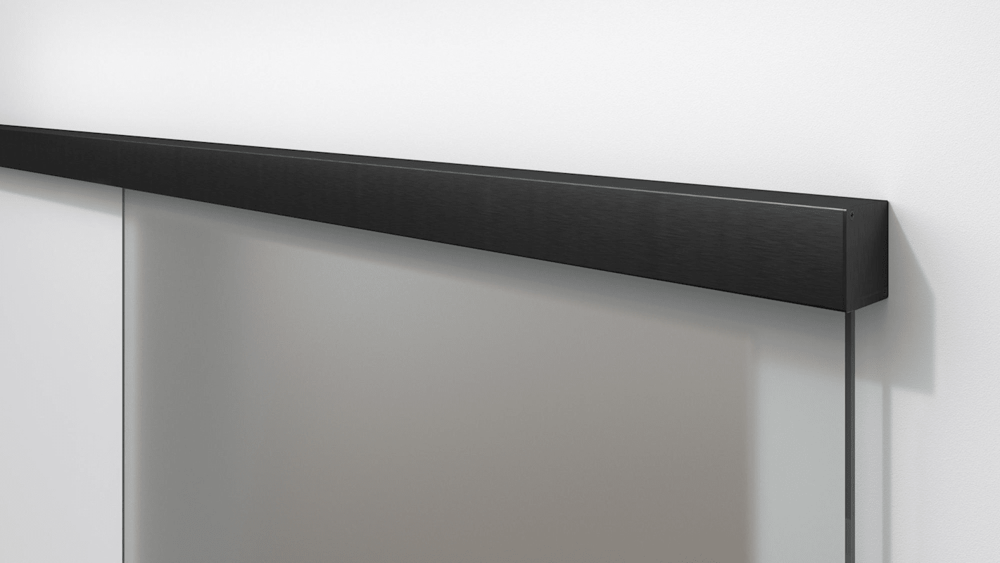 Schiebetür-Klemmbeschlag 9171 für Ganzglastüren, für Wand- oder Deckenm., Laufschiene 2001-3000 mm, inkl. Abdeckprofil, Tragkr. 120 kg, ohne Dämpfer, 3 Laufwagen, 2 Endkappen, ohne Selbsteinzug, Oberfl. 74 (Classic Black elox., ähnl. RAL 9005)