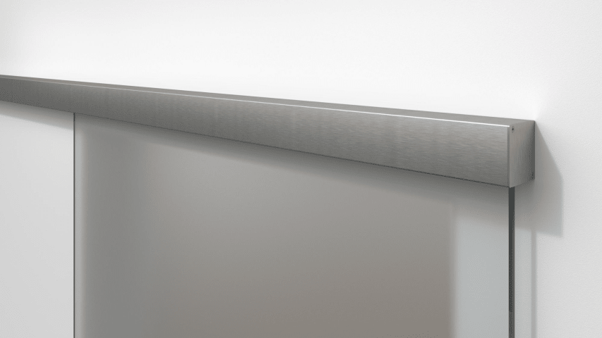 Schiebetür-Klemmbeschlag 9171 für Ganzglastüren, für Wand- oder Deckenmontage, Laufschiene 2000 mm, inkl. Abdeckprofil, Tragkraft 150 kg pro Garnitur, 2 Laufwagen, 2 Stopper, 2 Endkappen, 1 Bodenf., O