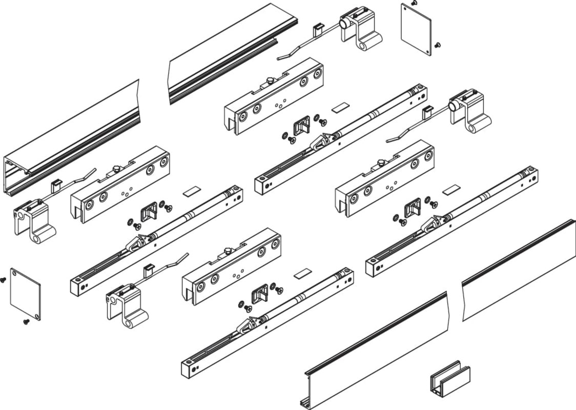 Schiebetür-Klemmbeschlag 9172 für Ganzglastüren, für Wand- oder Deckenmontage, Laufschiene 4000 mm, inkl. Abdeckprofil, Tragkr. 60 kg, Einzugsdämpfer, inkl. Zubehör für 2 flg. Türen, Oberfl. 41 (RAL 9