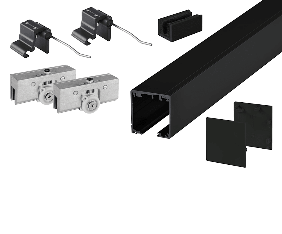 Schiebetür-Klemmbeschlag NOVARA 9271 für Glastüren, für Wandmontage, Laufschiene 2000 mm, Tragkraft 60 kg, 2 Laufwagen, 2 Stopper, 2 Endkappen, 1 Bodenf., Oberfl. 74 (Classic Black elox., ähnl. RAL 9005)