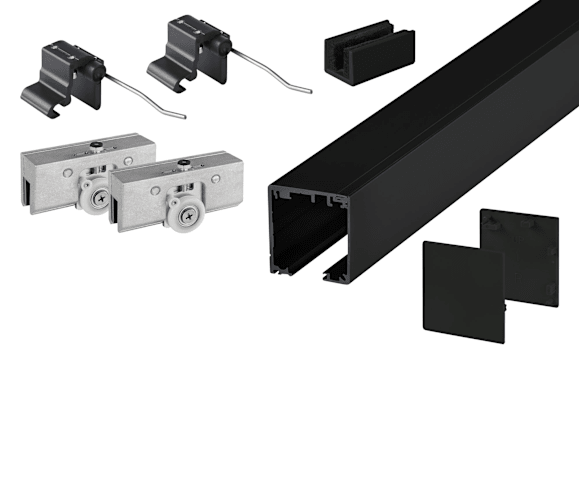 Schiebetür-Klemmbeschlag NOVARA 9271 für Glastüren, für Wandmontage, Laufschiene 2400 mm, Tragkraft 60 kg, 2 Laufwagen, 2 Stopper, 2 Endkappen, 1 Bodenf., Oberfl. 74 (Classic Black elox., ähnl. RAL 90
