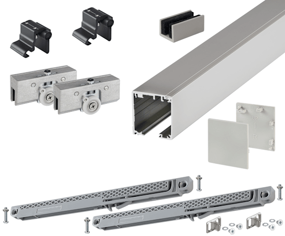 Schiebetür-Klemmbeschlag NOVARA 9272 für Glastüren, für Wandmontage, Laufschiene 2000 mm, Tragkraft 60 kg, inkl. SafeClose-Druckdämpfer, 2 Laufwagen, 2 Stopper, 2 Endkappen, 1 Bodenf., Oberfl. F1 (Sil