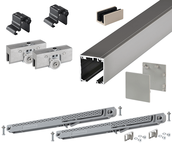 Schiebetür-Klemmbeschlag NOVARA 9272 für Glastüren, für Wandmontage, Laufschiene 2400 mm, Tragkraft 60 kg, inkl. SafeClose-Druckdämpfer, 2 Laufwagen, 2 Stopper, 2 Endkappen, 1 Bodenf., Oberfl. F9 (Ede