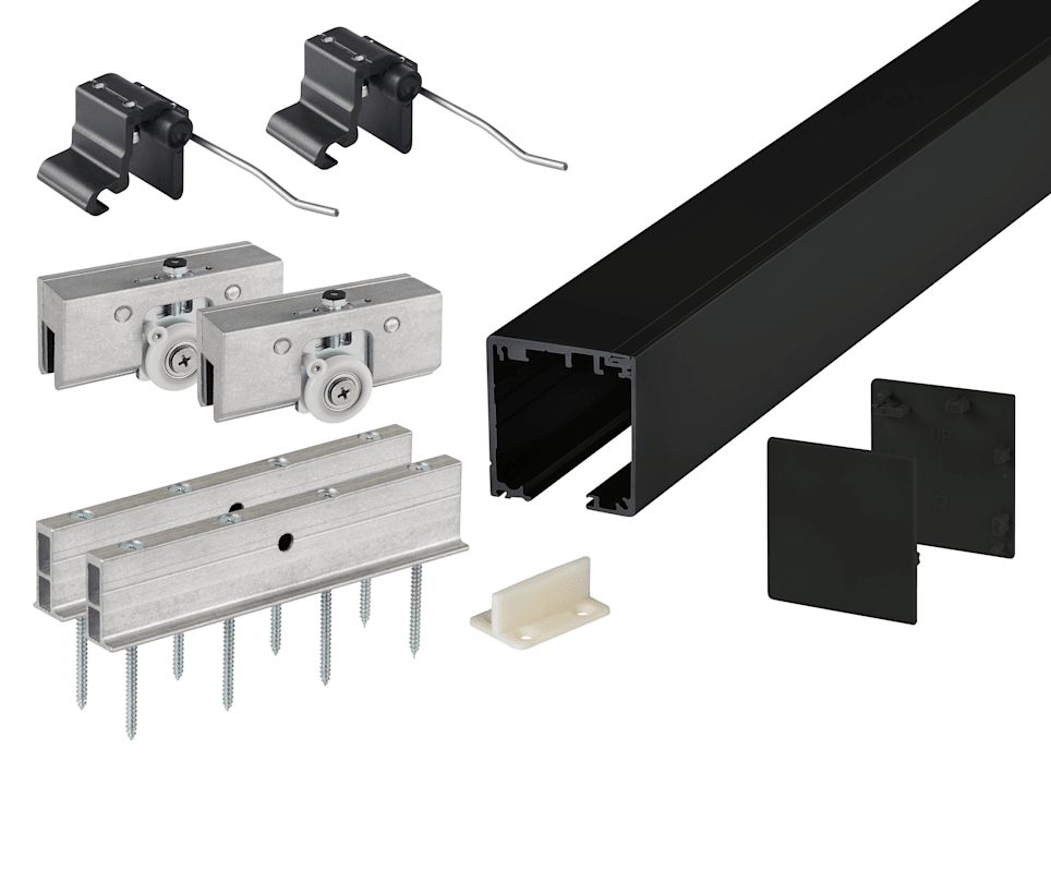 Schiebetür-Klemmbeschlag NOVARA 9277 für Holztüren, für Wandmontage, Laufschiene 2400 mm, Tragkraft 60 kg, 2 Laufw. mit Holzaufn.,2 Stopper,2 Endk.,1 Bodenf., Oberfl. 74 (Classic Black elox., ähnl. RA