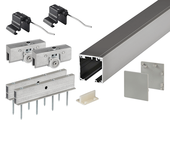 Schiebetür-Klemmbeschlag NOVARA 9277 für Holztüren, für Wandmontage, Laufschiene 2400 mm, Tragkraft 60 kg, 2 Laufw. mit Holzaufn.,2 Stopper,2 Endk.,1 Bodenf., Oberfl. F9 (Edelstahlfarben)