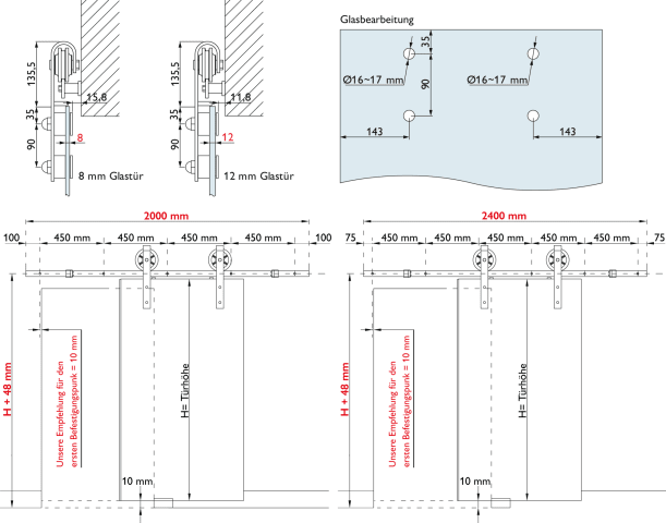 Schiebetürbeschlag DIMARO für Glastüren ohne Zarge, für 1-flg. Türen bis 1000 mm Türbreite, 80 kg, bestehend aus: Laufschiene 2000 mm, 2 Laufwagen, Bodenführung, 2 Stopper, 5 Wandbefestigungen, Oberfl