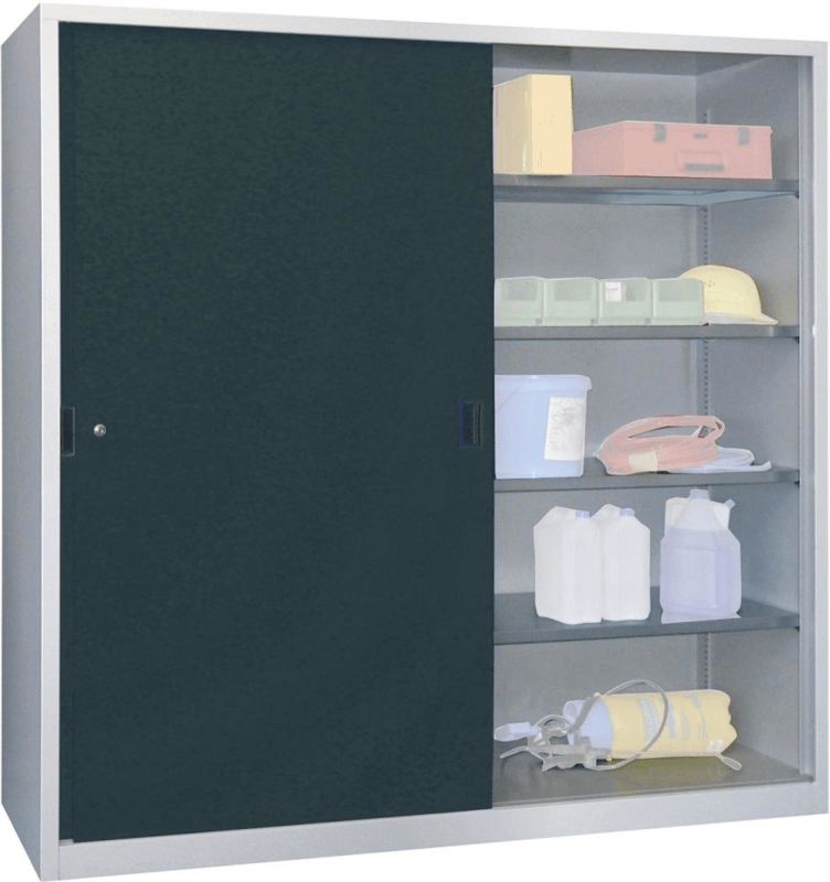 Schiebetürenschrank, Breite 2000 mm, mit Vollblechtüren und Mitteltrennwand, Böden verzinkt • Solide verschweißte Stahlblechkonstruktion • Hochwertige Pulverbeschichtung • Mit Trennwand • Breite: 2000 mm • Traglast Gehäuse: 600 kg bei gleichmäßig verteilter Last • Traglast je Einlegeboden: 80 kg bei gleichmäßig verteilter Last • Bodenverstellbarkeit: im Raster von 17 mm • Türen: mit Verstärkungstaschen, kugelgelagerten Spezialrollen und Drehdruckzylinderschloss • Einlegeboden: verzinkt