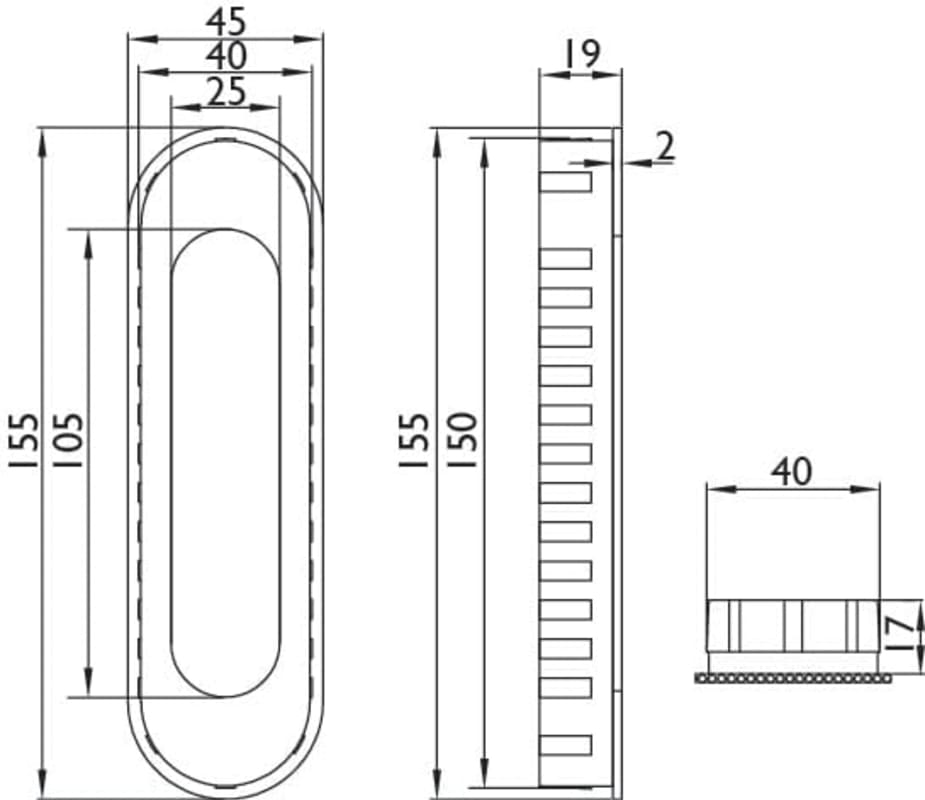 Schiebetürmuschel 3649 OL ohne Lochung, 154 x 45 x 19 mm, oval, ohne Anschraublöcher, Oberfl. 60 (Edelstahl matt)