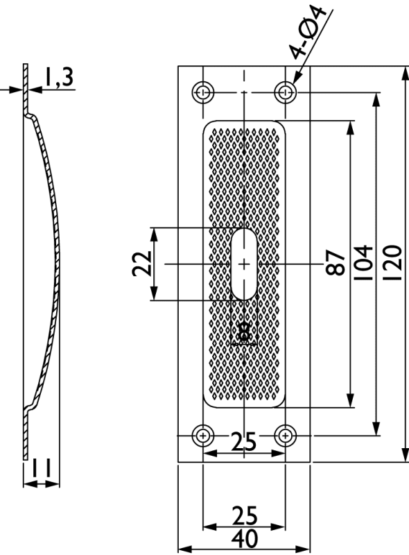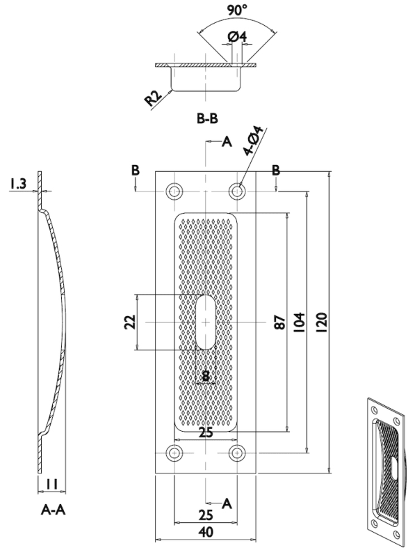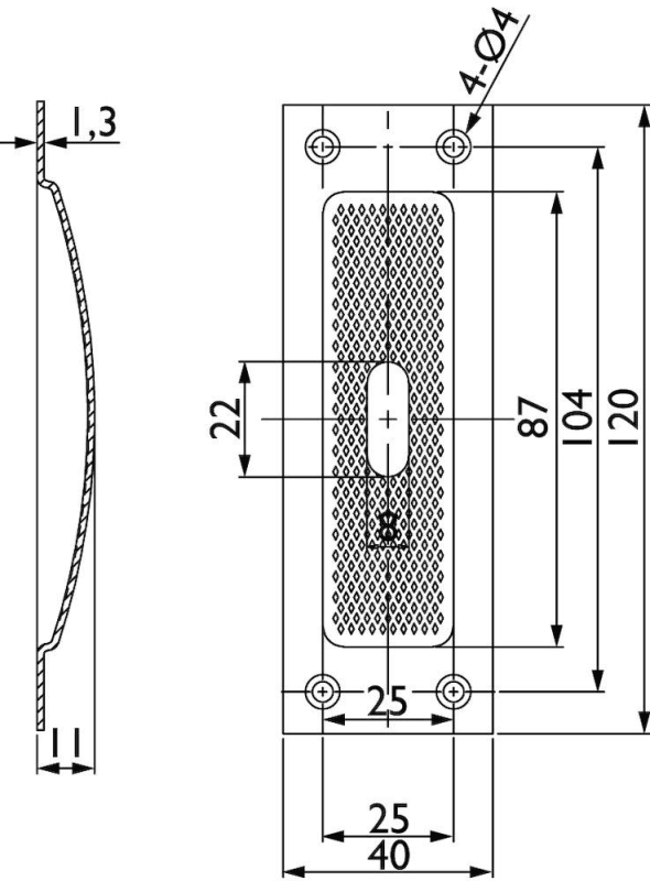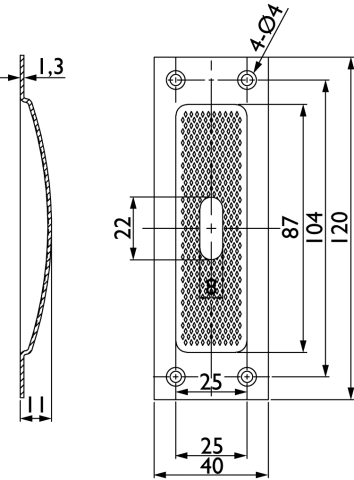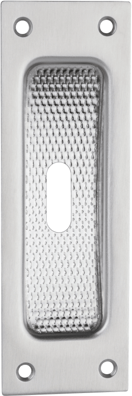Schiebetürmuschel 3671 BB gelocht, 120 x 40 mm, kantig, mit geriffelter Innenfläche, Fräßmass 93 x 29 x 13 mm, Oberfl. 60 (Edelstahl matt)