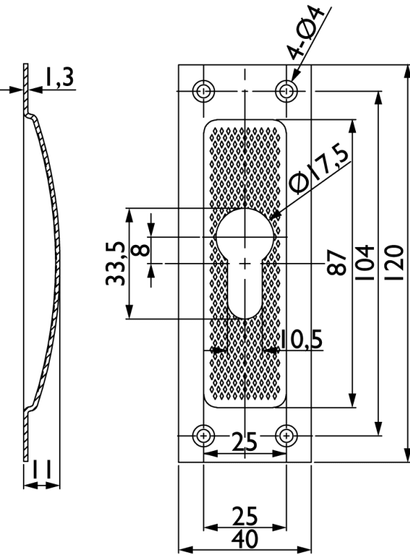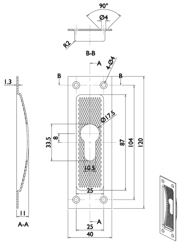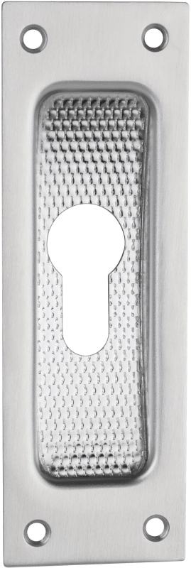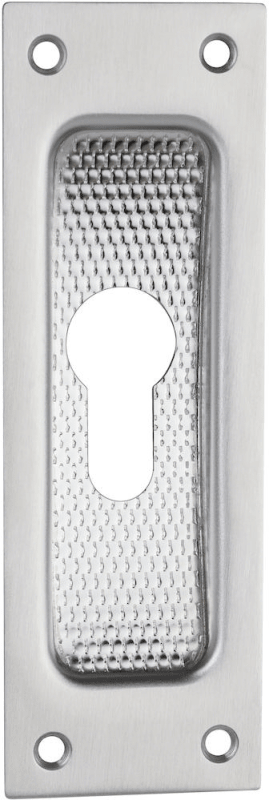 Schiebetürmuschel 3671 PZ gelocht, 120 x 40 mm, kantig, mit geriffelter Innenfläche, Fräßmass 93 x 29 x 13 mm, Oberfl. 60 (Edelstahl matt)