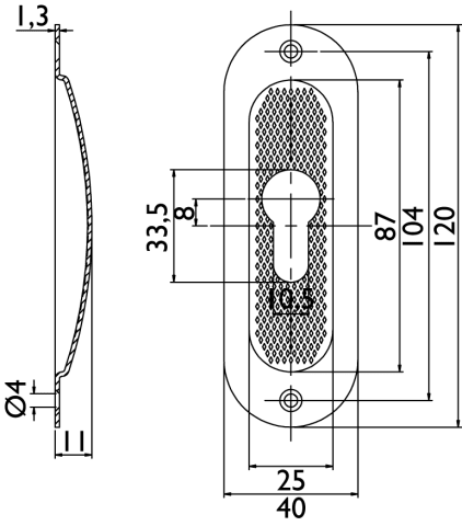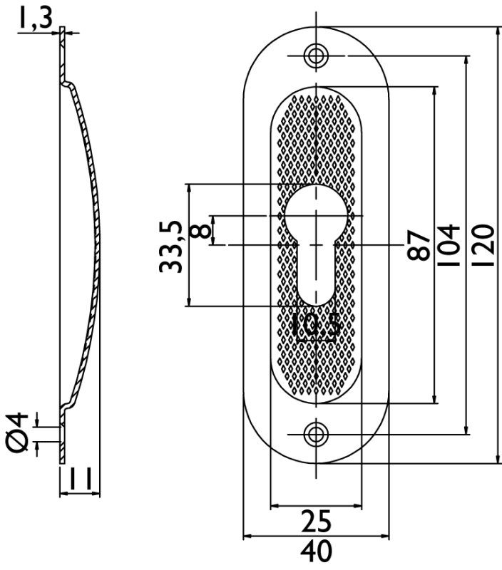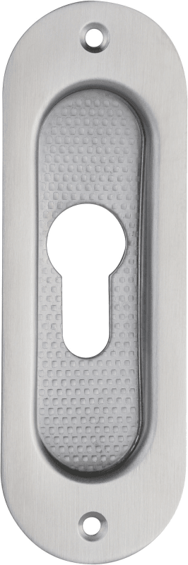 Schiebetürmuschel 3672 PZ gelocht, 120 x 40 mm, abgerundet, mit geriffelter Innenfläche, Mindestfräßmass: 86 x 27 x 10 mm, Oberfl. 60 (Edelstahl matt)