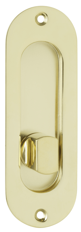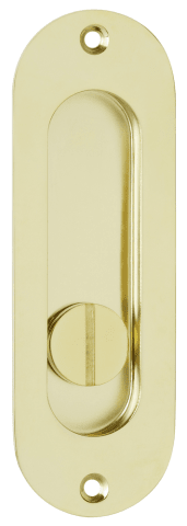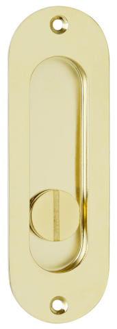 Schiebetürmuschel 3657 BAD, 120 x 40 mm, abgerundet / Tst. 37 - 43 mm, mit 2 Anschraublöcher / 2 Holzschrauben 3 x 13 mm, 1 Stück besteh. aus Riegel & Schlitzscheibenseite, Oberfl. 18 (PVD Messingfarb