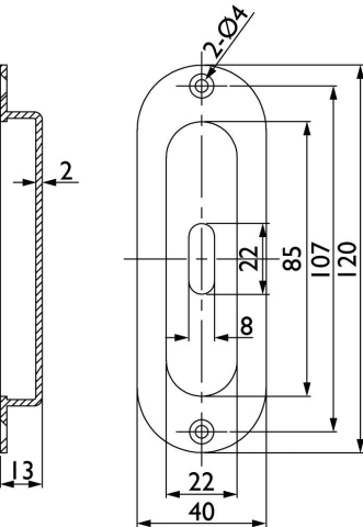 Schiebetürmuschel 3673 BB gelocht, 120 x 40 mm, abgerundet, mit 2 Anschraublöcher, Mindestfräßmass: 94 x 28 x 11 mm, Oberfl. 63 (Edelstahl poliert/Edelstahl matt)