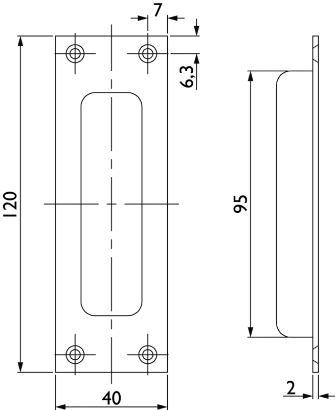 Schiebetürmuschel 3676 OL ohne Lochung, 120 x 40 mm, kantig, mit 4 Anschraublöcher, Mindestfräsmaß: 95 x 27,8 x 10 mm, Oberfl. 74 (Classic Black, ähnl. RAL 9005)