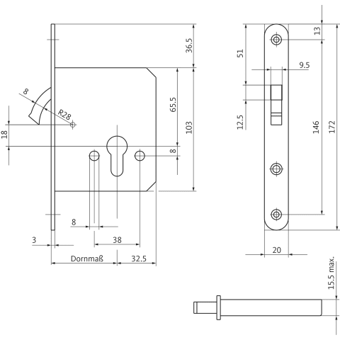 BKS Schiebetürschloss 0372; Produkttyp: Schiebetürschloss; Produkttyp (Hersteller): Schiebetürschloss; Ausführung: mit Zirkelriegel; Stulpform: Flachstulp; Material Stulp: Stahl; Schlosskastenhöhe: 10
