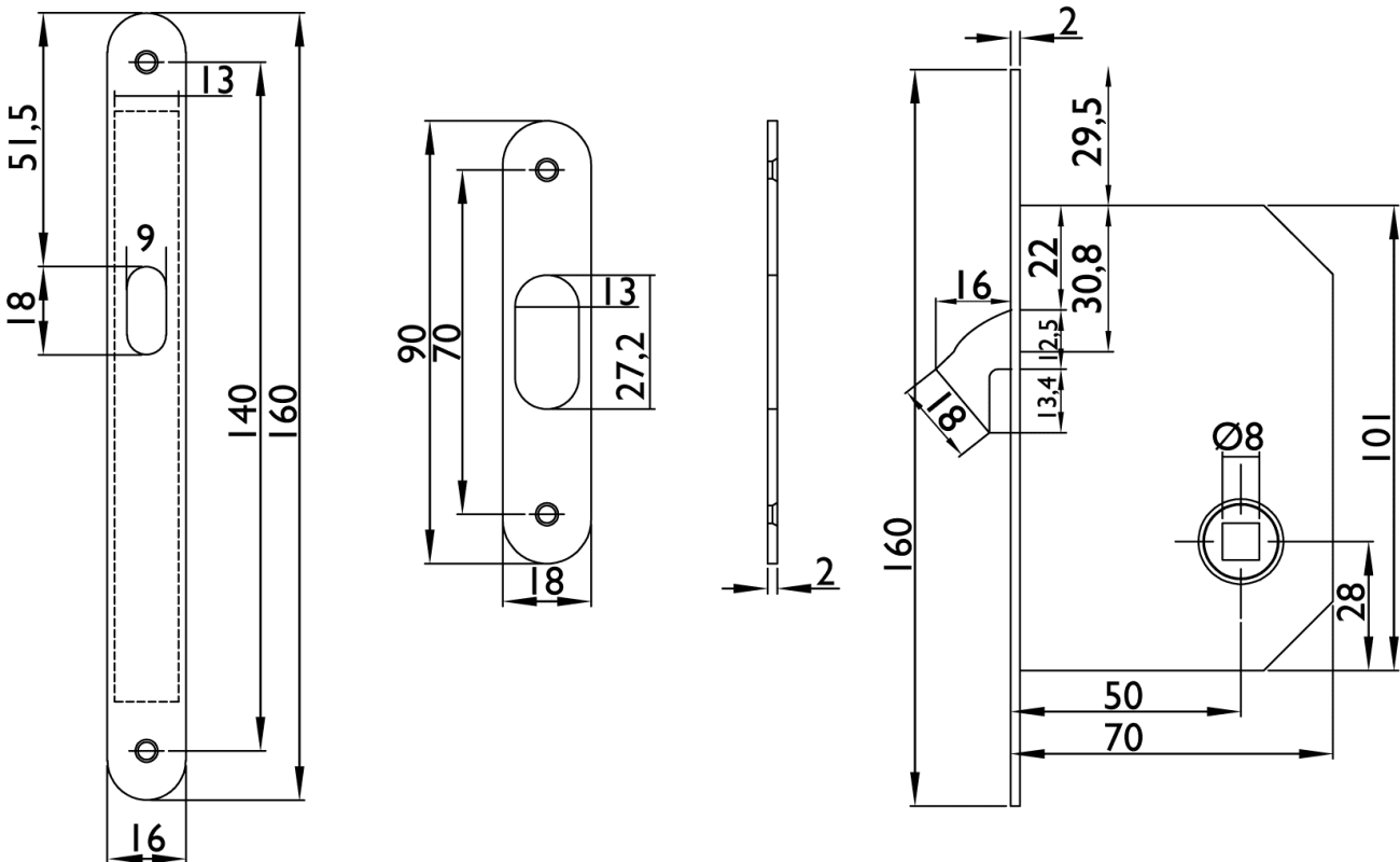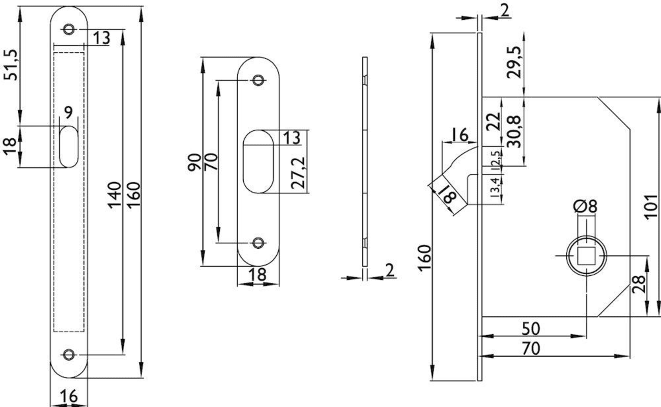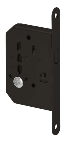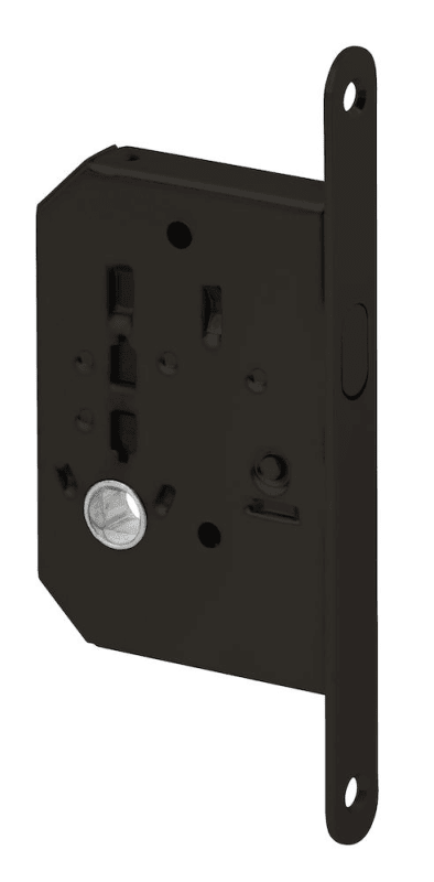 Schiebetürschloss lose zu Schlosstürset 3659, Stulp 160 x 16 mm inkl. Schließblech, mit Vierkant-Lochung für WC-Muschel, Oberfl. 74 (Classic Black, ähnl. RAL 9005)